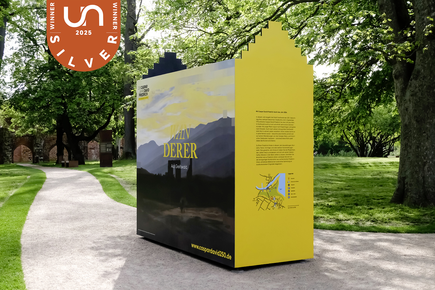 And another reason to celebrate: We are pleased to receive the award for the temporary wayfinding system for the 250th birthday of Caspar David Friedrich in Greifswald. We were honoured with Silver at the un design award 2025. Following the Indigo Design Award 2025 and the DNA Paris Design Awards 2025, this is already the third award for the project this year.
