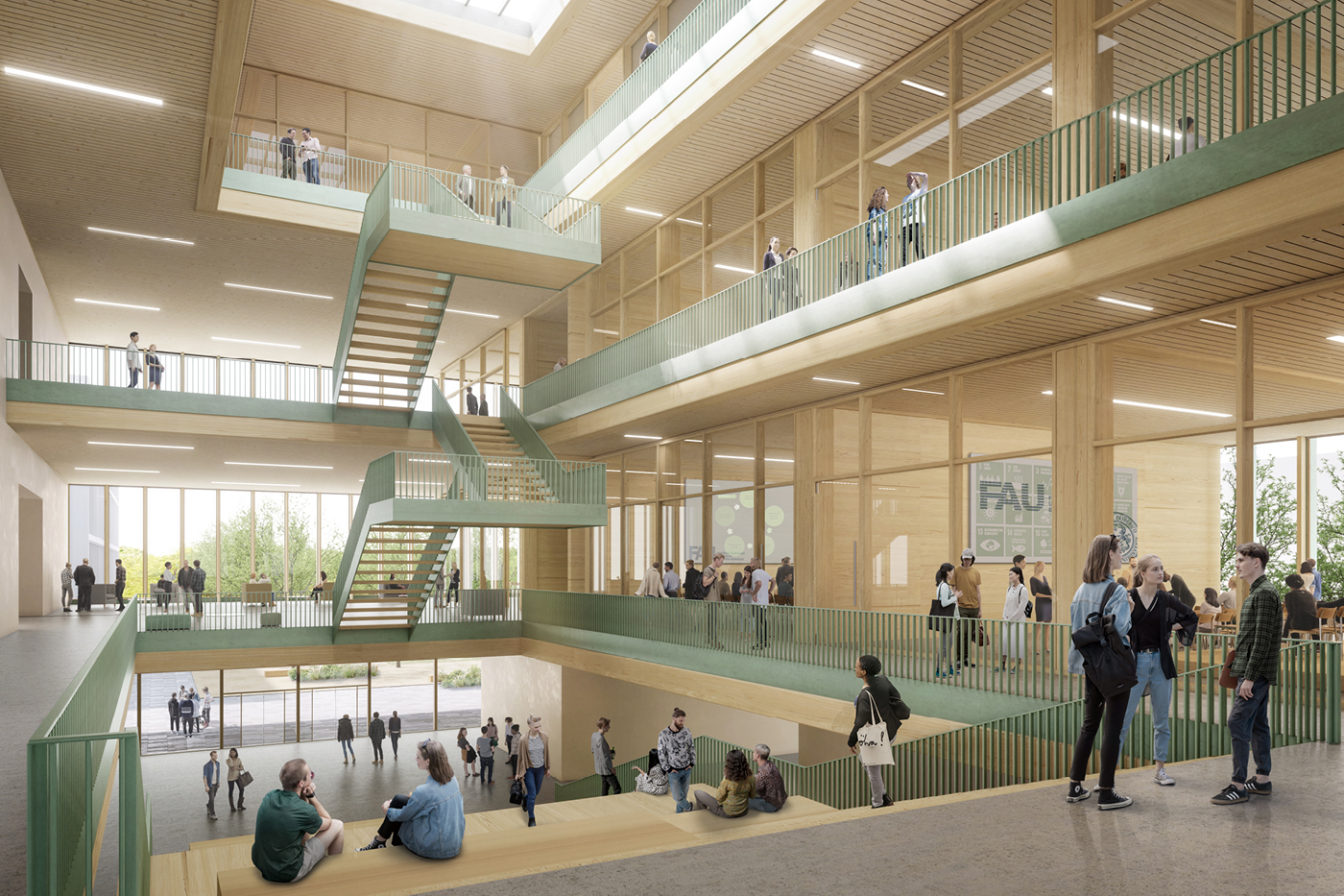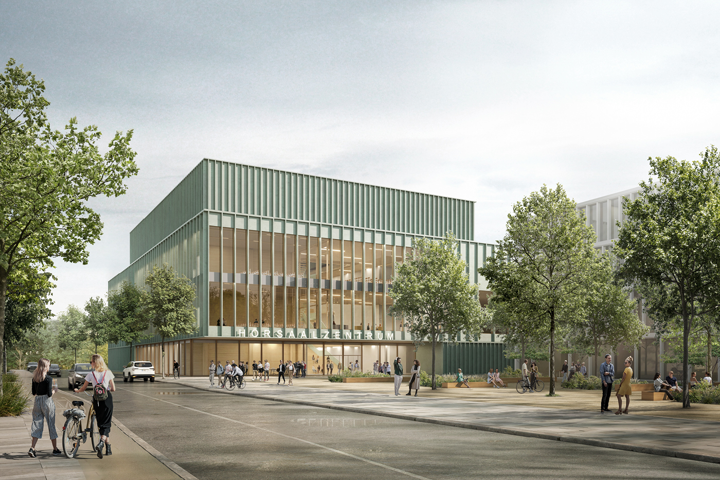 Avec ses grandes façades en verre, le nouveau bâtiment d’amphithéâtres de l’université Friedrich-Alexander-Universität Erlangen-Nürnberg à Erlangen relie l’espace extérieur au monde des sciences. Le foyer et ses galeries constituent l’accès central à tous les niveaux, permettant de créer un bâtiment de cubature compacte. Outre des amphithéâtres y trouvent place des salles de recherche ainsi qu’un espace d’exposition et un théâtre expérimental. Le développement de la signalétique est en cours…