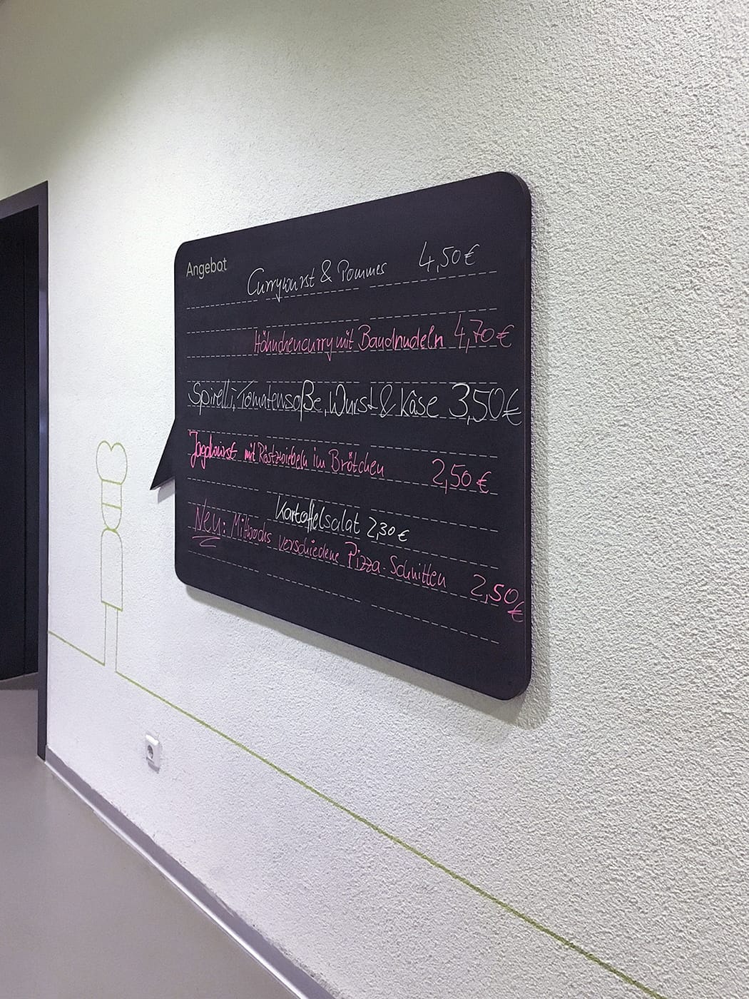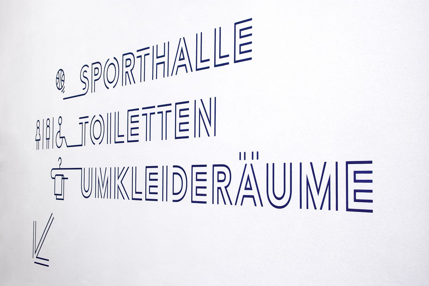L’école de l’industrie de Chemnitz n’est pas seulement réputée pour son bâtiment classé. Auparavant un des plus importants lycées professionnels d’Allemagne, cet établissement est lié étroitement au passé industriel de la ville. L’école fût en partie détruite pendant la seconde Guerre Mondiale, puis reconstruite avant d’être agrandie afin de former de nombreux jeunes adultes aux métiers techniques. La signalétique des nouveaux bâtiments avec salles de classes, cafétéria et gymnase se réfère par sa typographie à la tradition technique de l’école et accompagne quotidiennement les élèves avec un langage visuel familier. La forte présence des éléments de signalétique rend les cours de sport encore plus motivants.