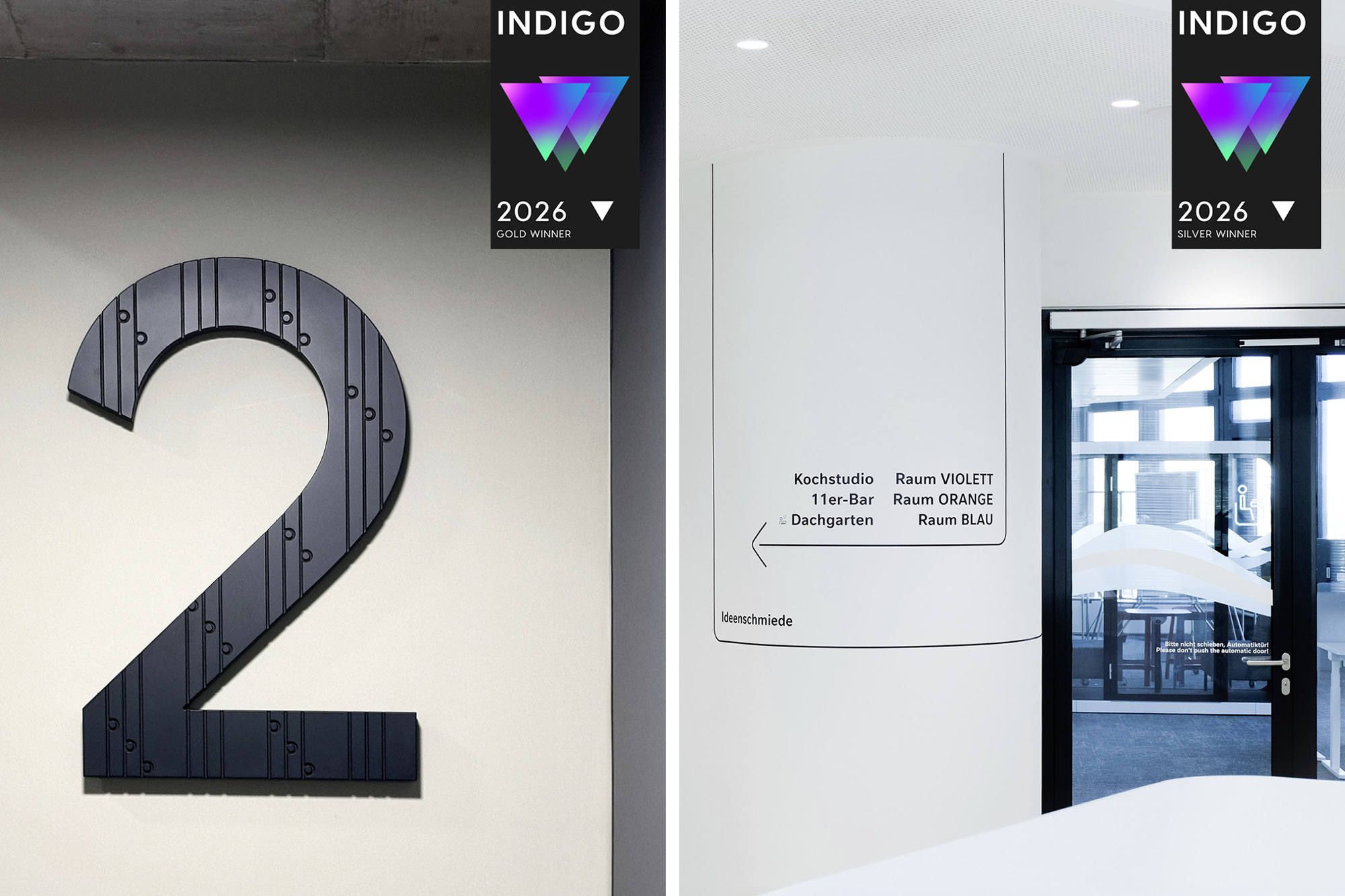 Wir freuen uns über die Auszeichnung von gleich zwei Projekten beim diesjährigen Indigo Design Award. Unsere Signaletik der neuen Zentrale von Nestlé Deutschland in Frankfurt wurde mit Silber in der Kategorie »Wayfinding for Graphic Design« geehrt und das Gebäudeleitsystem für den Gewerbehof Urban Yards in Berlin bekam sogar Gold.
