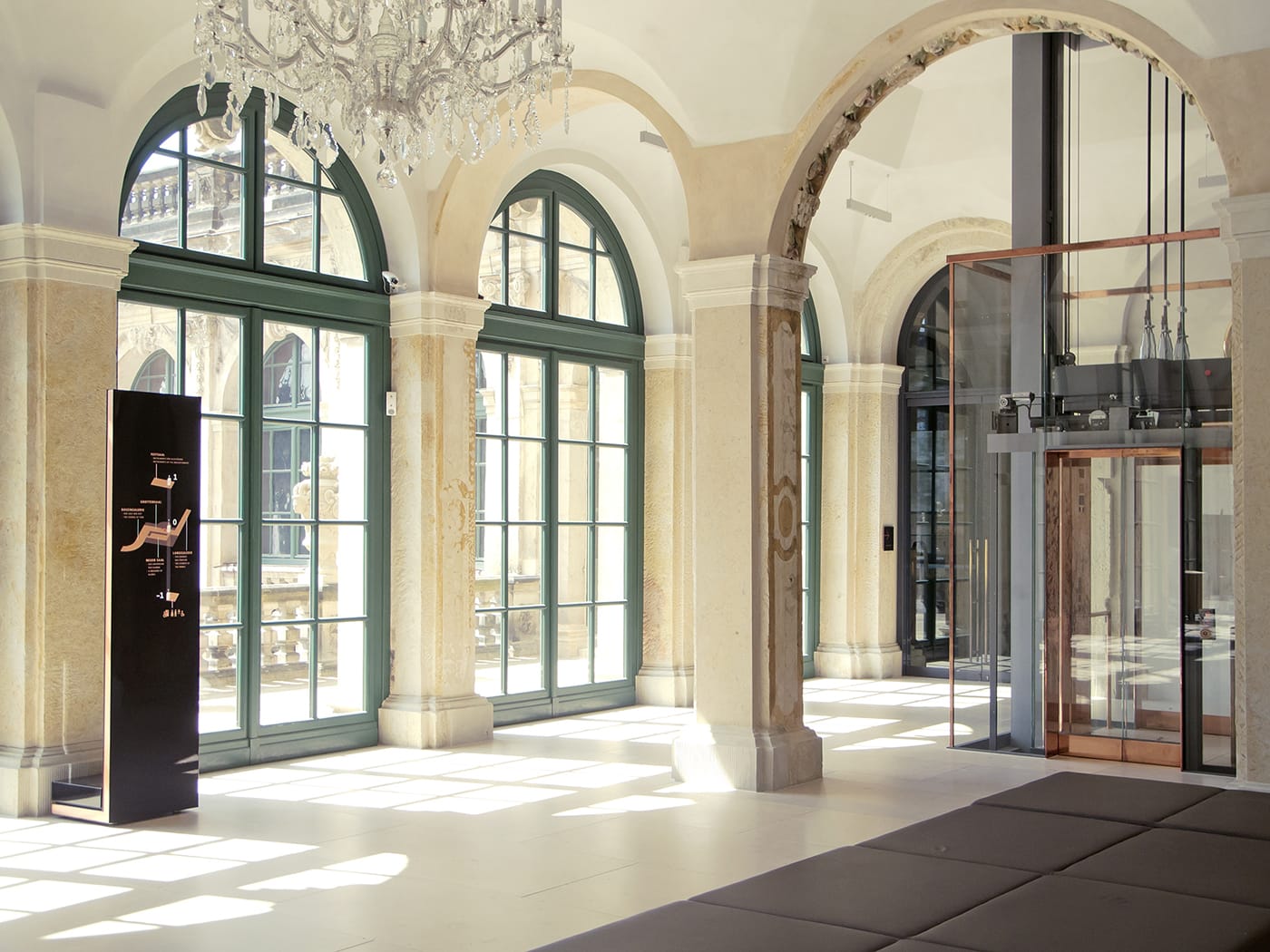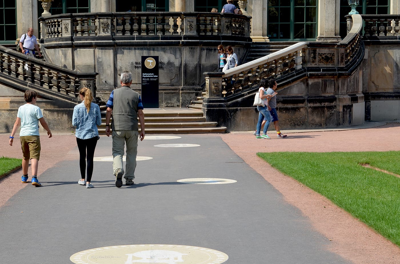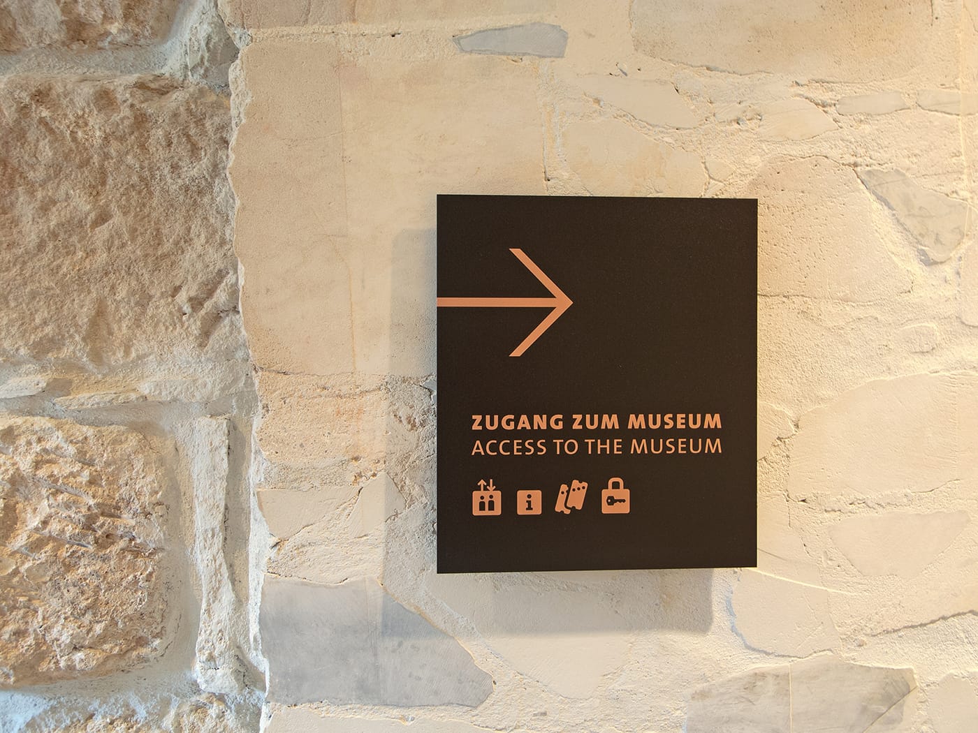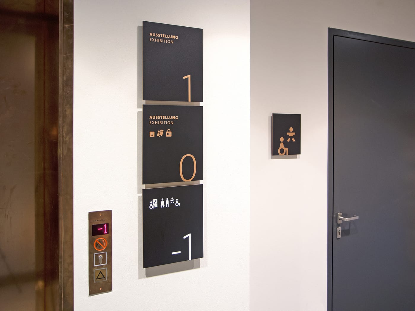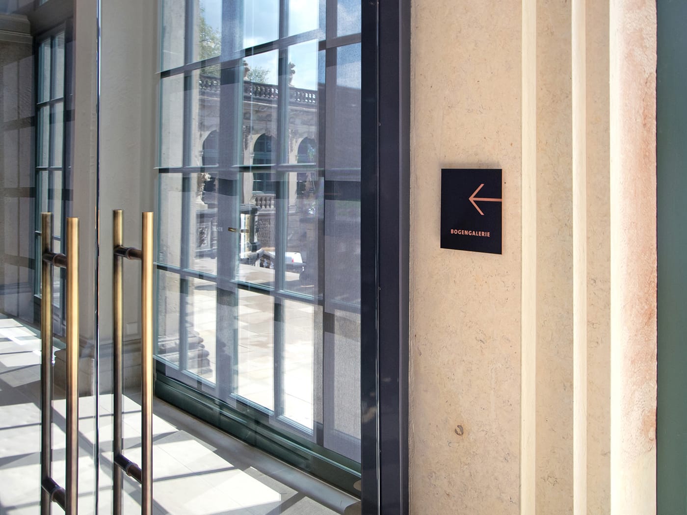 One of the world’s oldest collections of scientific instruments is housed in the Mathematisch-Physikalische Salon of the Dresden Zwinger. The collection of Augustus the Strong impresses with ornate telescopes, pocket watches and sky models that were pioneering for their time. The signage system not only connects the collection, it also underscores its special value. Black plaques with copper-coloured edges and lettering are both sophisticated and discreet, serving as an ideal setting for the instruments on display.