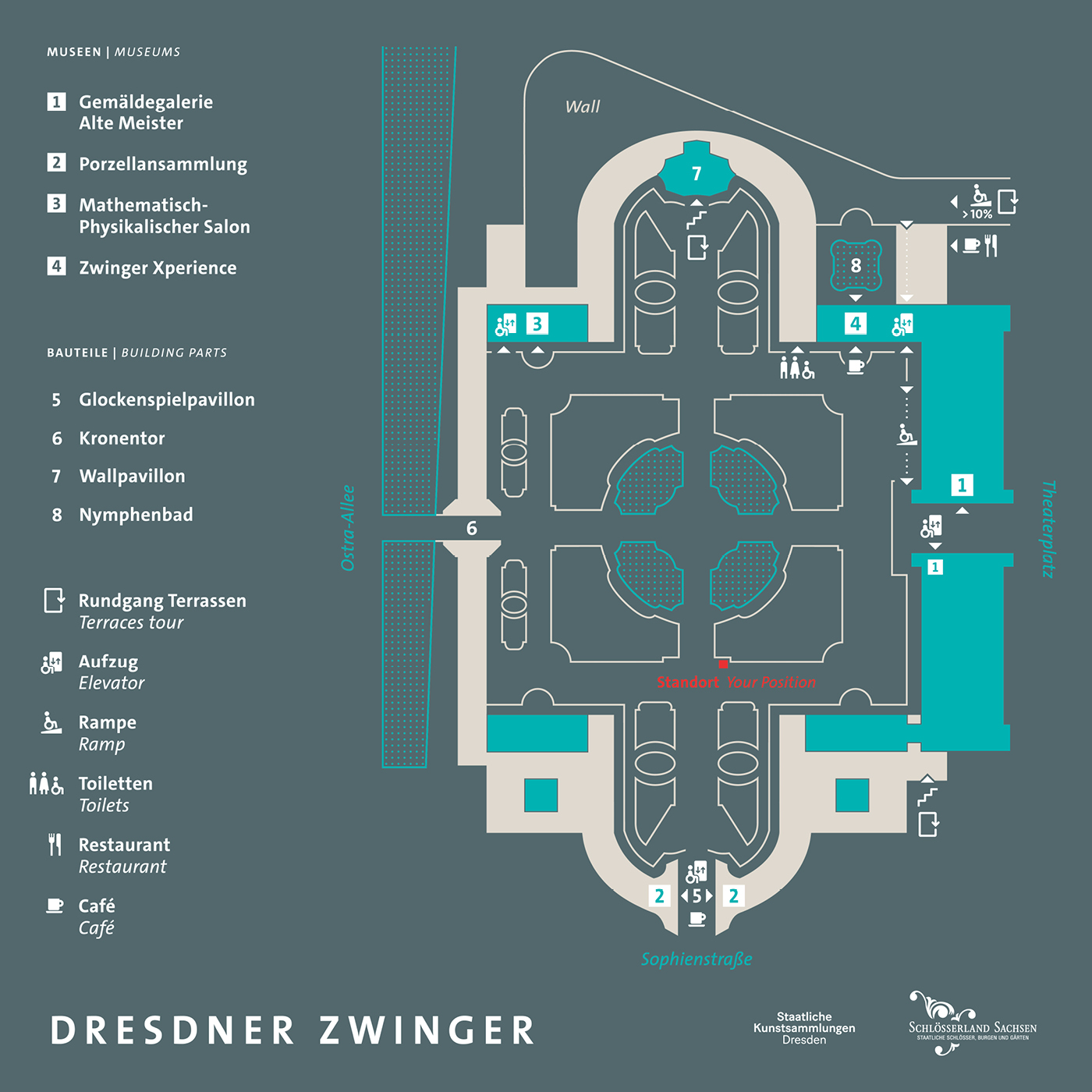 What a setting the Zwinger in Dresden offers. Offering effective and respectful orientational information is therefore all the more challenging. The site maps are located near ground level, enabling uninterrupted views of the heritage-listed complex. They round off the corners of the ornamental grassed sections along the natural axes of movement, as if they were integral elements. There is no need for anyone to lose their way here.