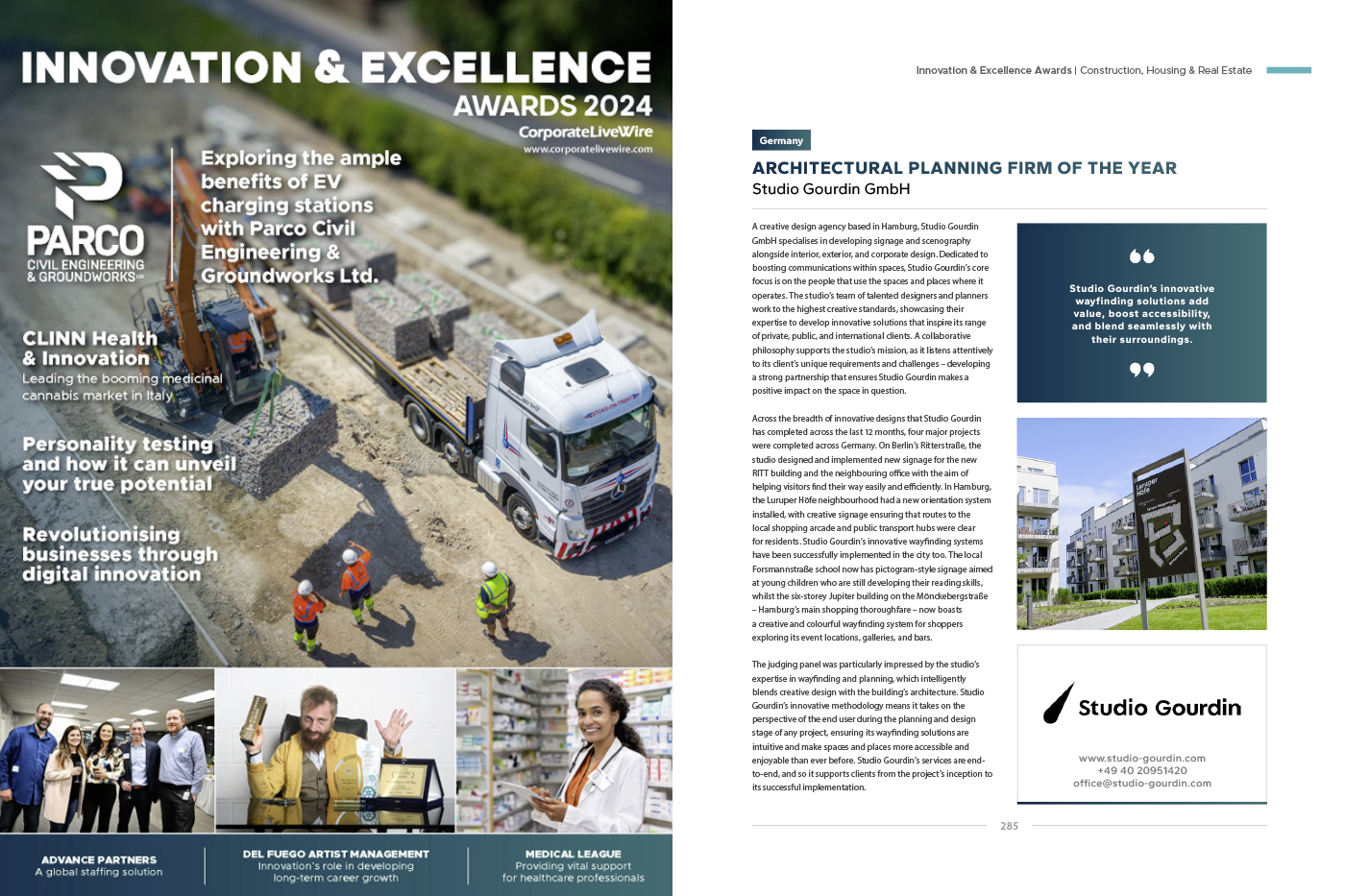 Wir haben wieder einen Grund zum Feiern! Studio Gourdin wurde bei den BUILD Architecture Awards 2025 als Sieger in der Kategorie »Best Wayfinding & Signage Design Company 2025 – Germany« ausgezeichnet. Wir freuen uns riesig!