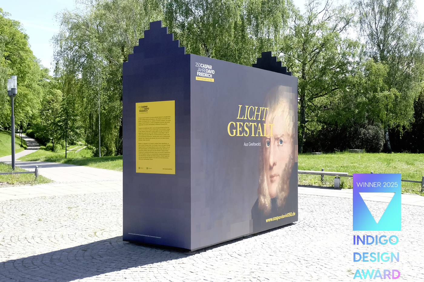 Ein Grund zum Feiern! Unsere Signaletik für das 250. Jubiläum von Caspar David Friedrich in Greifswald wurde mit Silber in der Kategorie »Wayfinding for Graphic Design« beim diesjährigen »Indigo Design Award« ausgezeichnet.